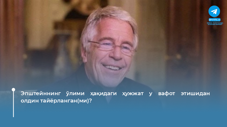 Эпштейннинг ўлими ҳақидаги ҳужжат у вафот этишидан бир кун олдин тайёрланган — Daily Mail. АҚШ Адлия вазирлиги томонидан ошкор этилган...