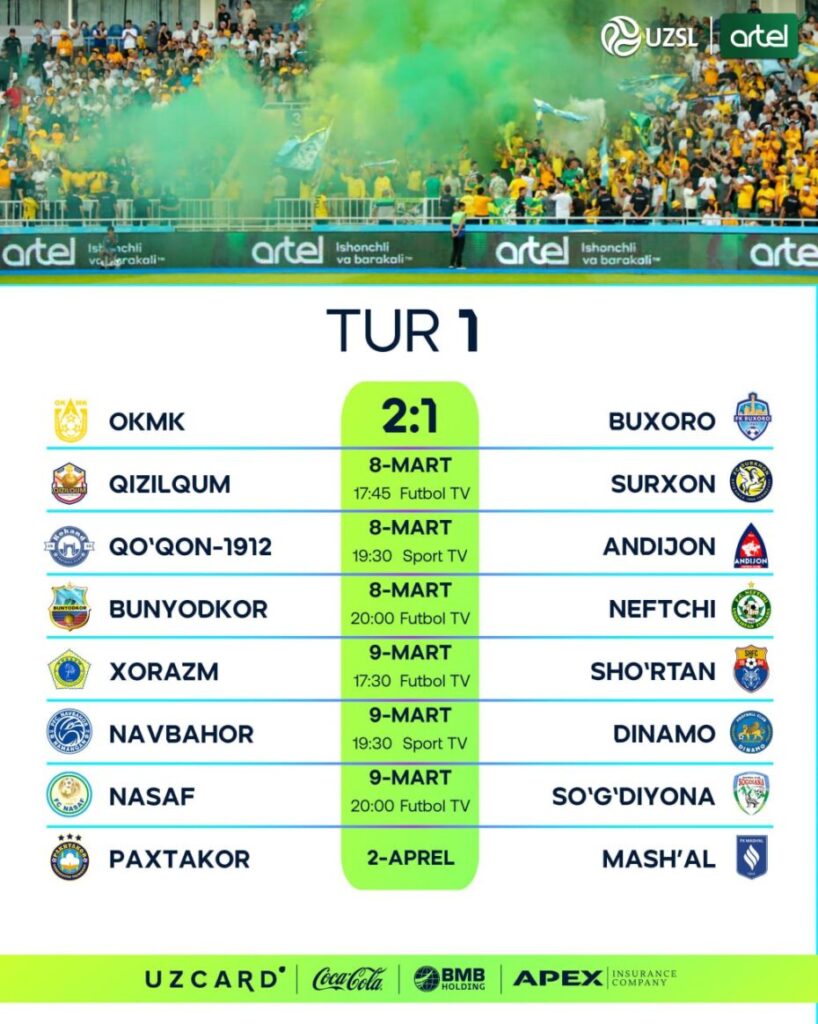 Суперлига 1-туридан ўрин олган ОКМК – «Бухоро» учрашуви бироз аввал якунланди. Ўйин Олмалиқдаги стадионда бўлиб ўтди ва мезбонларнинг 2:1 ҳисобидаги ғалабаси билан якунланди.