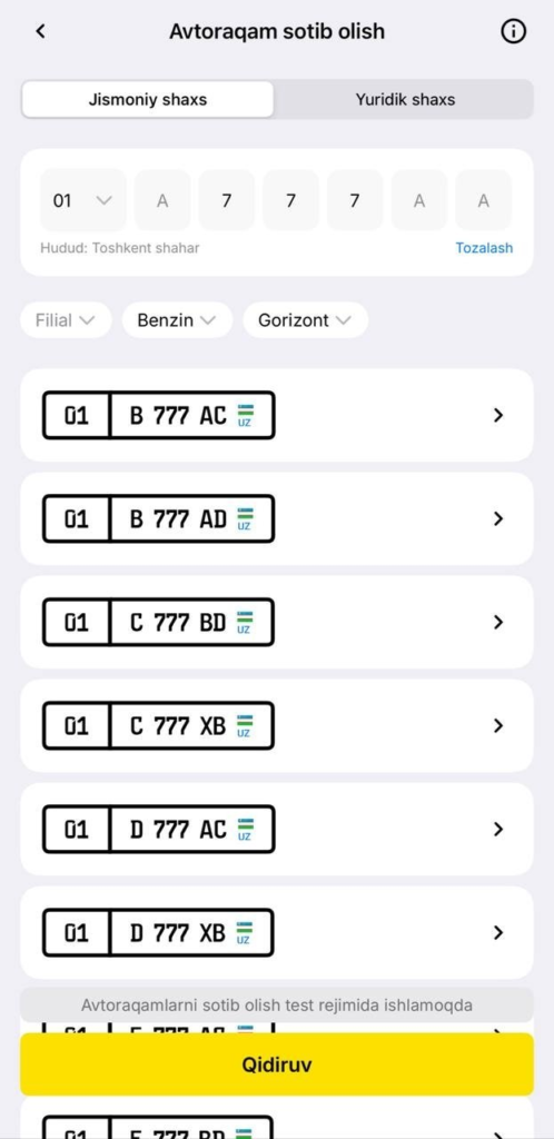 Юқорида айтилганидек, 1-босқичда аукционга чиқарилиб, сотилмаган рақамлар базага киритилган. 1 январдан бошлаб, исталган ҳарф комбинацияси ва рақамни терган ҳолда 7 млн сўмга чиройли рақам сотиб олиш мумкин бўлади.