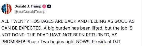 «20 нафар гаровга олинганларнинг барчаси қайтиб келди ва кутилгандек улар ўзини яхши ҳис қилмоқда. Оғир юк кўтарилди, аммо иш ҳали тугамади. Ўликлар ваъда қилинганидек қайтмади! Энди 2-босқич бошланади!!!» – АҚШ президенти Truth Social ижтимоий тармоқ платформасида шундай ёзди.