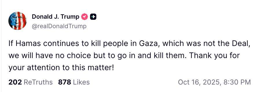 “Агар ҲАМАС келишувга амал қилмай Ғазода одамларни ўлдиришда давом этса, уларни ўлдиришдан бошқа иложимиз қолмайди”, деб пост қолдирган Трамп ижтимоий тармоқлардан бирида.