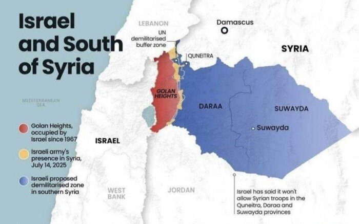 – Сариқ 🟡 билан белгиланган ҳудудлар Башар ал-Ассад қулаганидан 14 июлгача Исроил томонидан босиб олинган ҳудудлардир.