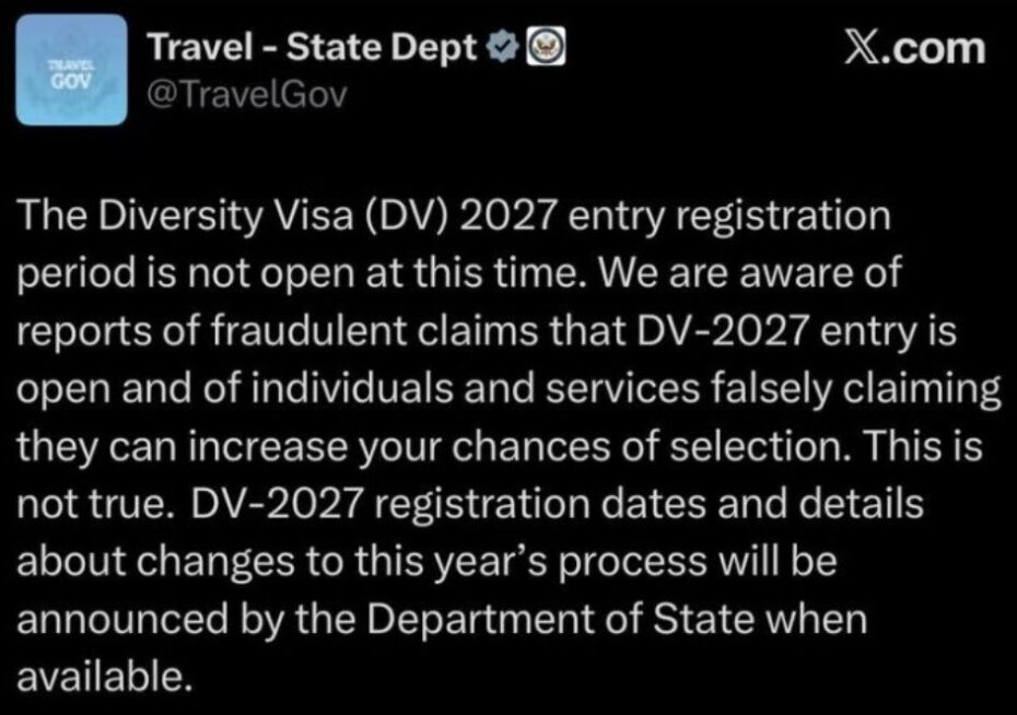 Айни вақтда интернетда “DV-2027 учун рўйхатдан ўтиш бошланди” деган сохта хабарлар тарқалмоқда. Бу маълумотлар ёлғон, деб хабар бермоқда АҚШ Давлат департаменти.