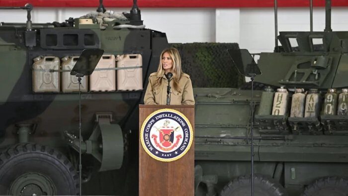 АҚШнинг биринчи хоними Мелания Трамп Нью-Ривер денгиз пиёда қўшинлари авиабазасида тахминан 1600 нафар ҳарбий ва уларнинг оилалари олдида чиқиш қилди. Қўшинларга миннатдорлик билдириш ва уларнинг оилаларига ҳамдардлик билдириш орасида Мелания келажакнинг қоронғу манзарасини тасвирлади. У қуйидагиларни айтди: