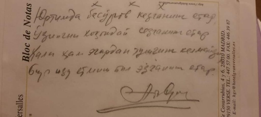 Абдулло Ориповнинг энди топилган ўрисларнинг салтанатига қарши тўртлиги. Эътибор қилинг, у Испаниянинг Мадрид шаҳрида, Реалгранд меҳмонхонасининг қайдлар қоғозига ёзилганича қолган.