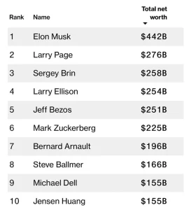 Бойлар рўйхатида Илон Маск 442 миллиард доллар билан ҳануз етакчиликни сақлаб турибди.