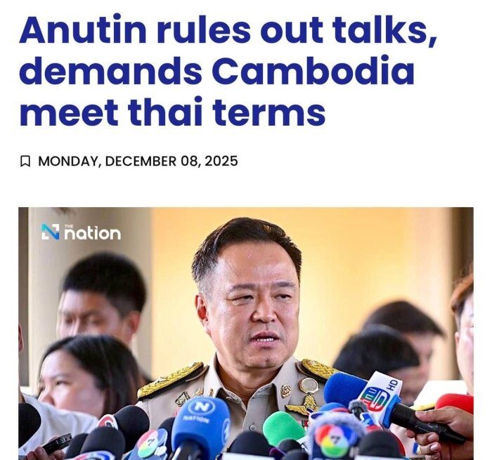 «Шу пайтдан бошлаб ҳеч қандай музокаралар бўлмайди. Агар биз жанговар ҳаракатларни тўхтатмоқчи бўлсак, Камбоджа Таиланд белгилаган талабларга амал қилиши зарур», — дея таъкидлади Анутин Чарнвиракул.