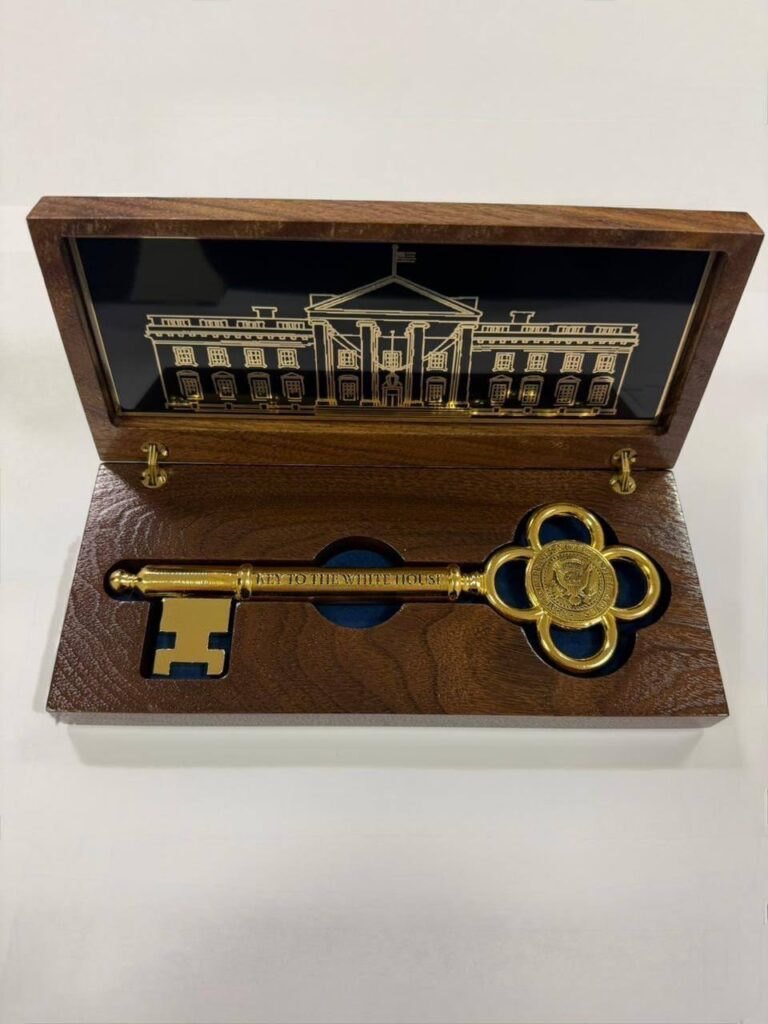 АҚШ президенти рамзий калитдан ташқари, имзоси қўйилган бейсбол кепкасини ҳам юборган, деб хабар беради Тоқаевнинг матбуот котиби Руслан Желдибай.