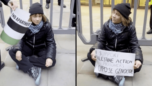 «Фаластин учун маҳбуслар» (Prisoners of Palestine) гуруҳи Тунбергнинг Palestine Action ҳаракатини қўллаб-қувватловчи плакат кўтариб тушган видеосини эълон қилди.