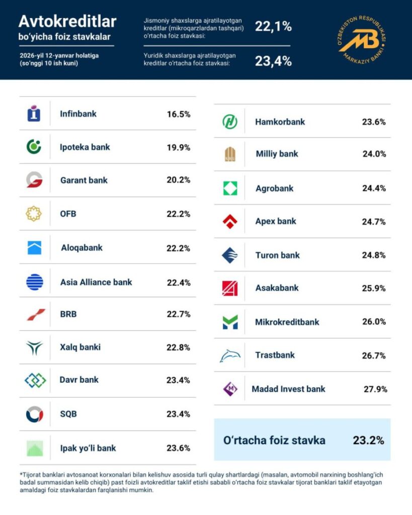 Марказий банк автокредитлар бўйича тижорат банклардаги ўртача фоизларни эълон қилди