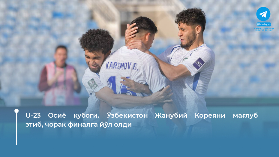 Бугун, 13 январь куни Равшан Ҳайдаров бошчилигидаги Ўзбекистон Олимпия терма жамоаси 2026 йилги U-23 Осиё кубоги “C” гуруҳи доирасидаги навбатдаги учрашувини ўтказди. Жанубий Кореяга қарши кечган баҳсда жамоамиз 2:0 ҳисобида ғалаба қозонди. Учрашув Ар-Риёд шаҳридаги “Шаҳзода Файсал бин Фаҳд” стадионида бўлиб ўтди.