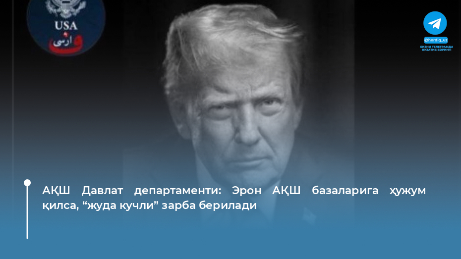 Баёнотда Президент Дональд Трампнинг барча вариантлар кучда қолиши ҳақидаги сўзлари эсга олинган ҳамда агар Эрон Америка объектларига ҳужум қилса, у “ўта қудратли куч”га дуч келишини таъкидланган.