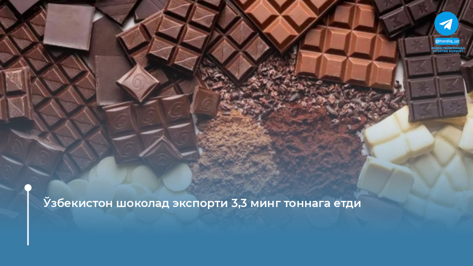 Миллий статистика қўмитаси маълумотларига кўра, 2025 йил январ–ноябр ойларида Ўзбекистон 24 та мамлакатга шоколад экспорт қилган. Етказиб беришлар умумий ҳажми 3,3 минг тоннани ташкил этиб, бу 2024 йилнинг шу даврига нисбатан 30 фоизга кўп.