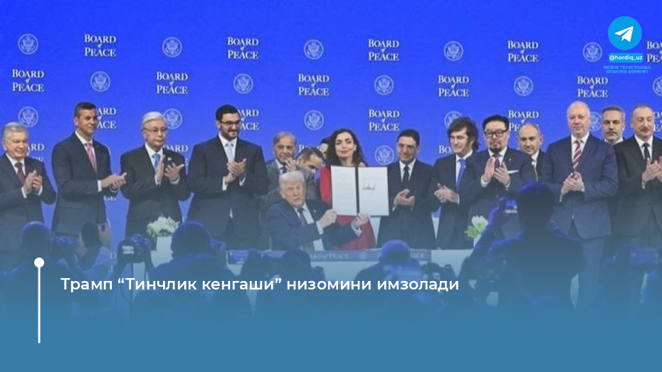 АҚШ президенти Доналд Трамп ўзи томонидан ташкил этилган янги халқаро тузилма — “Тинчлик кенгаши” низомини имзолади. Ҳужжатни имзолаш маросими Давосда бўлиб ўтаётган Жаҳон иқтисодий форуми доирасида ўтказилди.