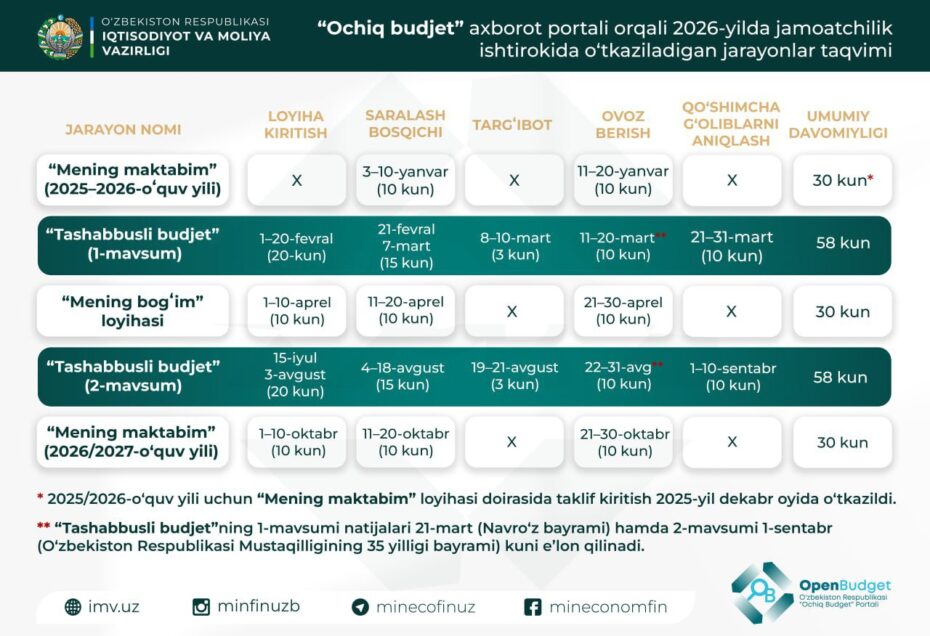 2026 йилги “Очиқ бюджет” лойиҳалари тақвими эълон қилинди