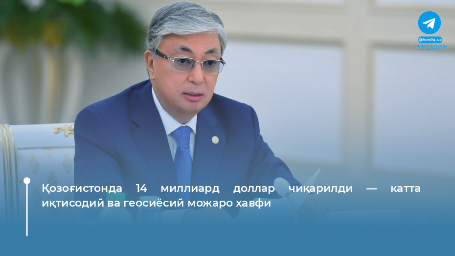 28 январ куни Қозоғистон президенти Қосим-Жўмарт Тўқаев Молиявий мониторинг агентлиги олдида чиқиш қилиб, 2025 йил давомида қўшни давлатдан бошқа мамлакатларга 7 триллион тенгедан ортиқ (тахминан 14 миллиард доллар) маблағ чиқарилганини маълум қилди. Президент бу ҳолатни қонун ва иқтисод нуқтаи назаридан қабул қилиб бўлмайдиган ҳолат деб баёнот қилди.