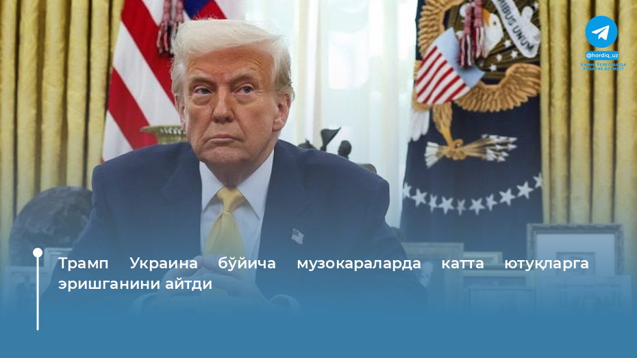 Америка етакчиси Дональд Трамп Украинадаги можарони ҳал этиш бўйича музокараларда катта прогресс борлигини маълум қилди. Бу ҳақда у ўз кабинети йиғилишида айтди.