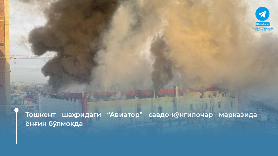 Бугун, 31-январ куни соат 15:47 да Тошкент шаҳар, Яшнобод тумани, Паркент кўчасида жойлашган “Авиатор” савдо маркази биноси ёнayotganлиги тўғрисида Тошкент шаҳар ФВББга хабар қилинган. Қутқарув экипажлари соат 15:53 да воқеа жойига етиб борган.