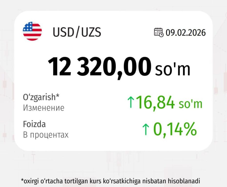 Юртимизда Доллар яна бироз ошади 09.02.2026 11:49 Валюта биржасидаги савдоларда долларнинг расмий курси 16-17 сўмга ошиши прогноз қилинмоқда. Доллар кетма-кет учинчи ҳафта ошишда давом этмоқда. Дўстларингизга ҳам юборинг: Continue Reading Previous OneID орқали шахсий маълумотлар устидан назорат кучайтирилдиNext Электрон-скоринг тизими ишга туширилади Мавзуга доир мақолалар Юртимизда Виза бермайман, деб каллани қотирма! Бизни жигаргушамиз, қизимиз АҚШнинг ТОП университетининг $380 000 долларлик грантини ютиб олди! 09.02.2026 12:45 Юртимизда Бу ҳафта об-ҳаво қандай бўлади? 09.02.2026 12:17 Юртимизда Хосеп Гвардиола Абдуқодир Ҳусанов ҳақида: Ўзбекистондан келган, Францияда олти ой ўтказиб, бу ерга келди! 09.02.2026 12:15