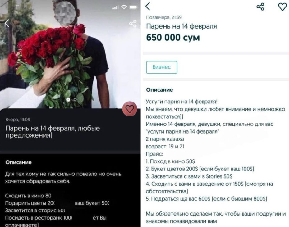 Ижарага йигит хизмати: интернетда 14 февраль куни ёлғиз бўлган хотин-қизлар учун эълонлар пайдо бўлди
