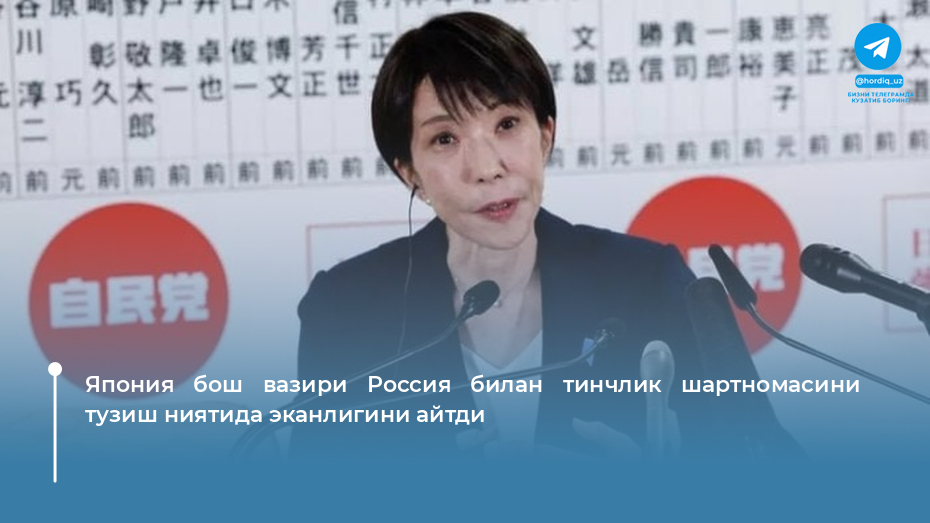 Хорижда Япония бош вазири Россия билан тинчлик шартномасини тузиш ниятида эканлигини айтди 20.02.2026 21:33 Бу ҳақда Санаэ Такаити қуйи палата парламентида маълум қилди. «Икки мамлакат ўртасидаги муносабатлар оғир ҳолатда бўлишига қарамай, ҳудудий муаммони ҳал этиш ва тинчлик шартномасини тузиш йўналиши ўзгармади», — деди у. Дўстларингизга ҳам юборинг: Continue Reading Previous АҚШнинг Киевга ёрдами сезиларли даражада қисқарди Мавзуга доир мақолалар Хорижда АҚШнинг Киевга ёрдами сезиларли даражада қисқарди 20.02.2026 20:33 Хорижда Эрзурум 6–8 март кунлари ФИС Сноуборд Жаҳон кубогига мезбонлик қилади 20.02.2026 16:30 Хорижда Вой ланъати!.. Эркак армияга бормаслик учун жинсини ўзгартирди!.. 20.02.2026 12:15