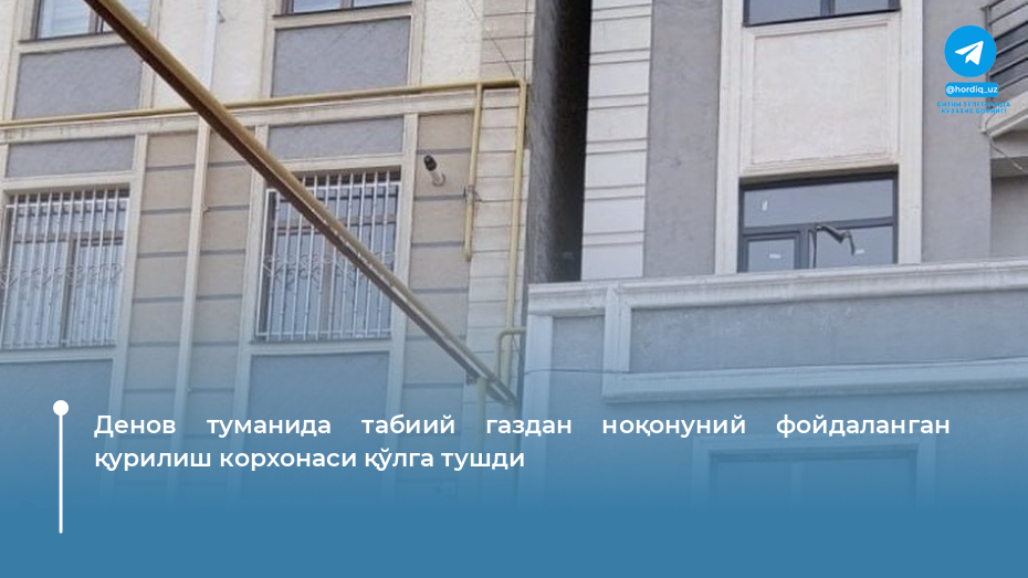 “Ўзэнергоинспекция” томонидан Сурхондарё вилоятида ўтказилган назорат тадбирида Денов туманида «О.Р.И.» МЧЖга қарашли қурилиш корхонаси объектида ўзбошимчалик билан тармоққа уланиб, табиий газдан ноқонуний фойдаланиб келаётганлиги аниқланди.