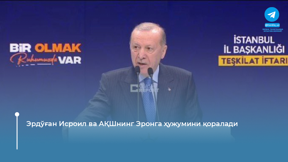 “Биз бугунги, Эрон суверенитетини очиқдан очиқ бузувчи ҳамда дўст ва қардош Эрон халқи тинчлигига таҳдид солувчи ҳужумларни қоралаймиз. Исроилнинг провокациялари билан бошланган Америка-Исроил ҳужумларидан чуқур қайғудамиз ва хавотирдамиз. Биласизки, биз узоқ вақт давомида келишмовчиликларни мулоқот йўли билан ҳал қилиш учун улкан саъй-ҳаракатларни амалга оширдик. Минтақамиздаги бошқа давлатлар ҳам қўлларидан келган барча ишни қилдилар. Бироқ томонлар ўртасидаги ишонч инқирозини енгиб ўтиб бўлмагани, шунингдек, Исроилнинг жараённи барбод қилишга бўлган давомий уринишлари сабабли кутилган натижага эришилмади”, дейди Эрдўған.