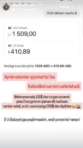 “Ҳеч кимни хавотирга қўйиш ниятим йўқ эди. Аввалига Дубайда қолиб кетганимни айтгим келмаган эди. Уйга етиб олгач, ‘хавотирга ўрин йўқ, уйимга соғ-саломат етиб келдим’, деган маънода сторис қўймоқчи эдим. Лекин рейслар номаълум муддатга кечиктирилгани сабаб мендан хавотир олиб ёзаётганларга жавоб беришга мажбурман,” — дейди у.