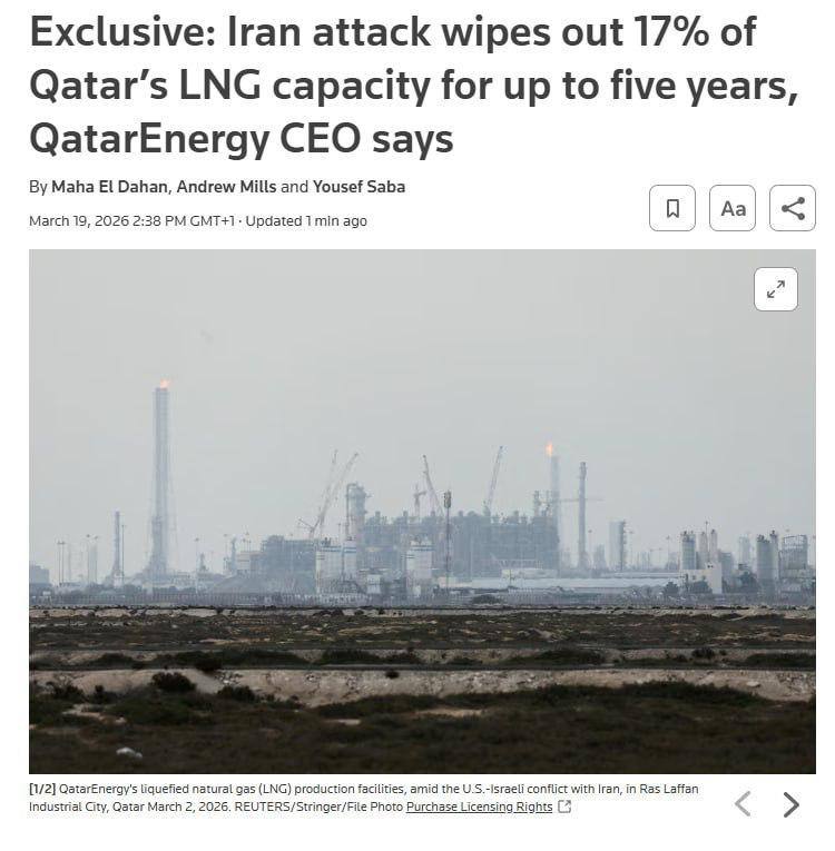 QatarEnergy раҳбари Саад ал-Кааби Reuters агентлигига берган интервьюсида газни суюлтириш бўйича 14 та заводдан иккитаси ва битта газ конденсати ишлаб чиқариш корхонаси зарар кўрганини айтди. Оқибатда яқин 3–5 йил ичида Қатар йилига 12,8 миллион тонна суюлтирилган табиий газни йўқотади.