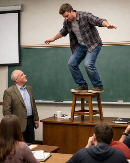 Талабалар орасидан пичир-пичир ўтди. Азиз бир лаҳза иккиланди, лекин мағрурлиги йўл бермади. У эски, силлиқ лакланган стол устига сакраб чиқди. Энди у пастдагиларга тепадан қарарди. Нутқини давом эттирди, аммо энди овозида салбий титроқ пайдо бўлди. Оёғи остидаги стол бир оз қимирларди.