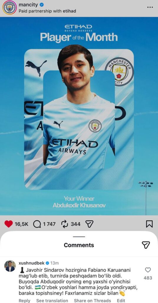 Абдуқодир Ҳусанов яна бир бор эътироф этилди — у Манчестер Сити жамоасининг март ойи учун энг яхши ўйинчиси деб топилди.
