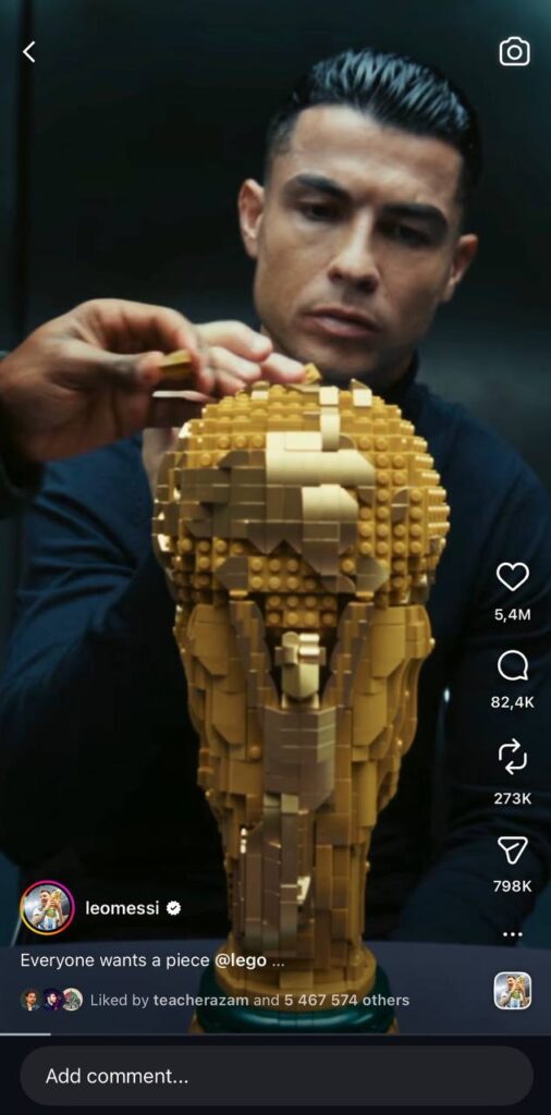 Қизиқарли жиҳат: Instagram’да LEGO билан бирга Роналду, Мбаппе, Винисиус ҳамда FIFA’нинг Жаҳон чемпионати саҳифаси ҳамкорлик қилган. Месси эса бу коллаборацияда иштирок этмаган ва видеони алоҳида жойлаштирган. Шунга қарамай, унинг видеоси бошқаларникига қараганда кўпроқ томоша ва лайк тўплаган.