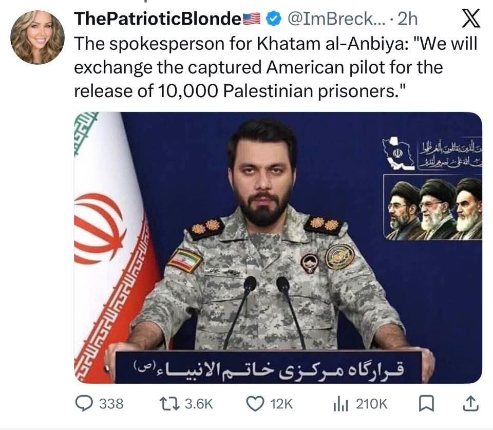 Эроннинг «Хотам ал-Анбиё» марказий қароргоҳи вакили шов-шувли баёнот билан чиқди. Баёнотга кўра, Эрон томони қўлга олинган Америка ҳарбий учувчисини озод қилиш учун кескин шарт қўйган.