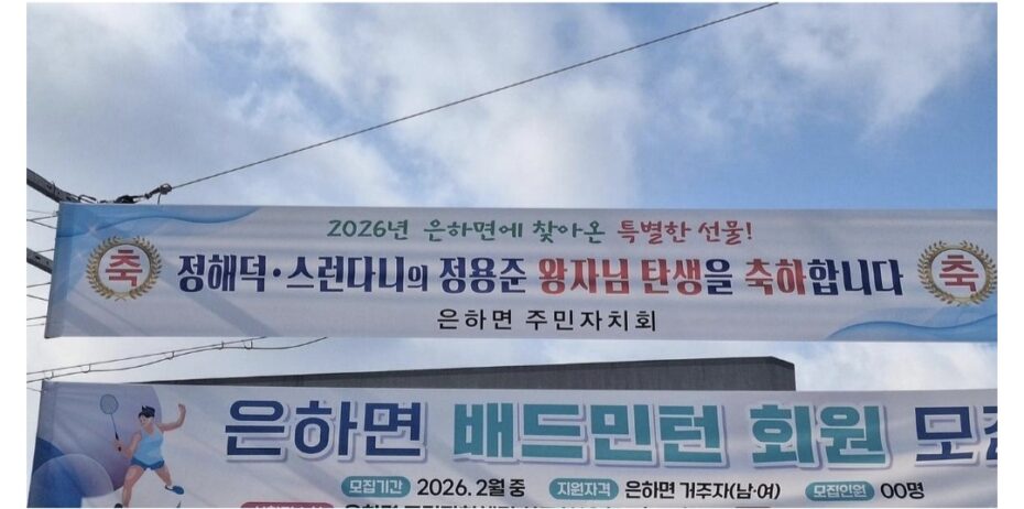 Шаҳарда янги туғилган чақалоқни қутловчи баннер (Хонсон тумани томонидан тақдим этилган)да: