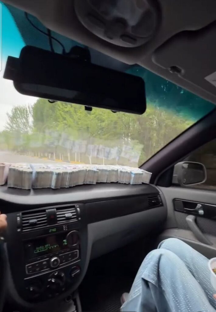 Видеодаги манзарага қаранг: Гентра машинасининг олд ойнаси пул тахламлари билан тўлиб кетган. Ҳатто ҳайдовчининг кўзи йўлдан кўра кўпроқ пул тахламларига қадалгандек. Бу пуллар йўлни тўсиб, хавфсизликни хавф остига қўйса-да, ҳайдовчи учун бу муҳим эмас. У учун муҳимроғи — шу миллионлар билан мақтаниш ва кимнидир ҳавасини (ёки ҳасадини) уйғотишдир.