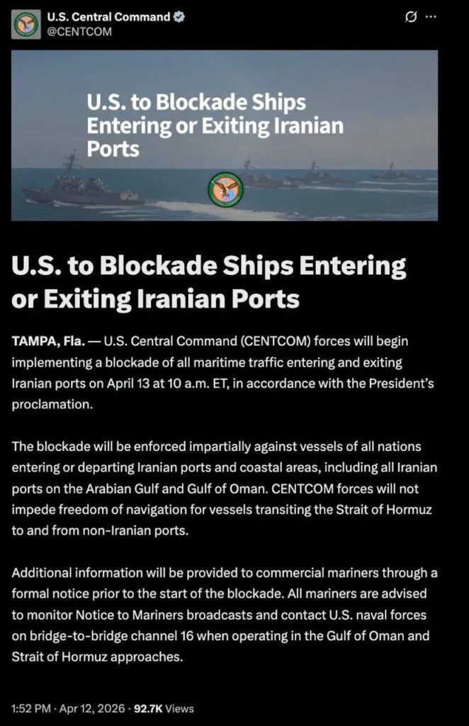 Гап Эрон портларига кираётган ва уларни тарк этаётган кемалар ҳақида бормоқда, деб маълум қилди АҚШ Марказий қўмондонлиги.