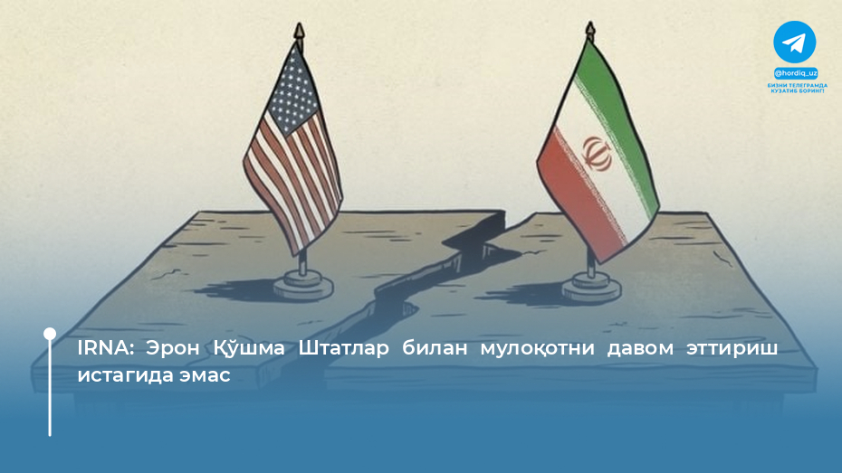 Хорижда IRNA: Эрон Қўшма Штатлар билан мулоқотни давом эттириш истагида эмас 20.04.2026 02:03 Эрон Қўшма Штатлар билан музокараларнинг иккинчи босқичида иштирок этишдан бош тортди. «Эрон музокараларнинг иккинчи раундида қатнашишдан бош тортди», — дейилади IRNA агентлигининг X ижтимоий тармоғидаги нашрида. Дўстларингизга ҳам юборинг: Continue Reading Previous Европа Иттифоқи иқтисодий инқироз сабаб ҳарбийлашиш йўлини танламоқдаNext Туркия Ҳўрмуз бўғозига муқобил йўл сифатида “Ўрта йўлак” лойиҳасини фаол тарғиб қилмоқда Мавзуга доир мақолалар Хорижда АҚШ ва Эрон ўртасидаги музокаралар яқин 24 соат ичида қайта тикланади 20.04.2026 03:31 Хорижда Шекспирнинг Лондондаги уйи жойлашуви аниқланди 20.04.2026 03:05 Хорижда Туркия Ҳўрмуз бўғозига муқобил йўл сифатида “Ўрта йўлак” лойиҳасини фаол тарғиб қилмоқда 20.04.2026 02:31