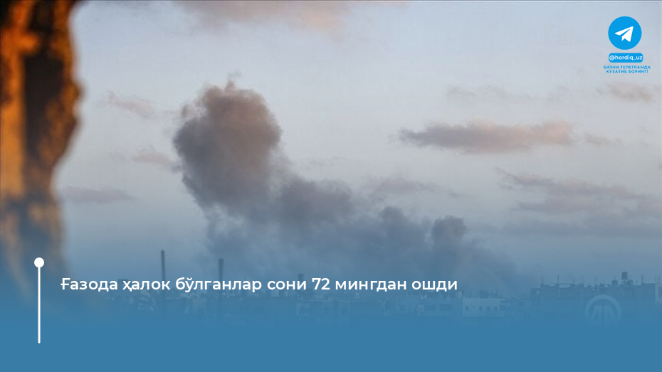 2023 йил октябрдан буён Исроил армиясининг Ғазо секторига ҳужумлари оқибатида ҳалок бўлганлар сони 72 553 нафарга етди.