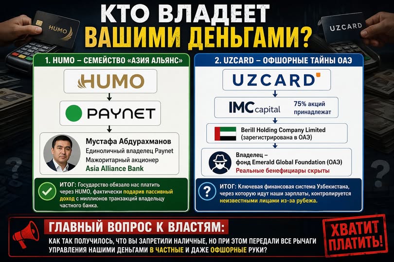 * Натижа: Давлат бизни HUMO орқали тўлашга мажбур қилди ва аслида миллионлаб транзакциялардан келадиган пассив даромадни хусусий банк эгасига совға қилди.