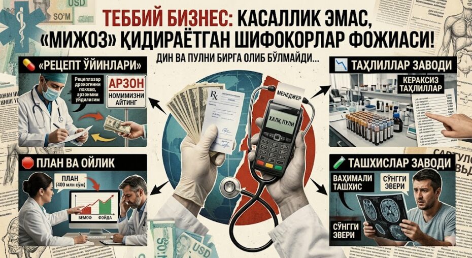 Бугун шифохонага борсангиз, сизни бемор эмас, «пулдор мижоз» сифатида қарши олишаётгандек туюлмаяптими? Афсуски, тиббиёт деб аталган муқаддас соҳа секин-аста совуққон бизнес машинасига айланиб бормоқда.